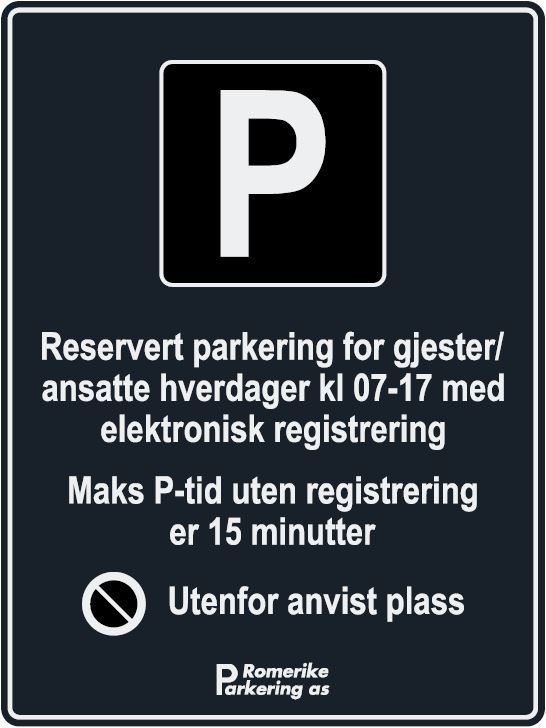 Som hovedregel vil det vil være et hovedskilt på vei inn til hvert enkelt parkeringsområdet. Ved samme plassering vil Parkeringsvilkårene stå. Når fører passerer disse skilt så aksepteres parkeringsvilkårene for parkeringsområdet.